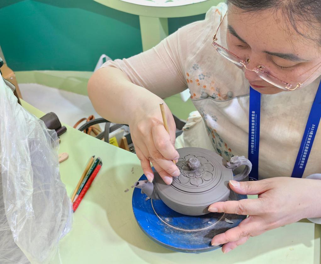 ?在人來(lái)人往的喧鬧中,來(lái)自陜西銅川的市級(jí)非遺傳承人徐杰專注地在茶壺上雕琢花紋。刀鋒流轉(zhuǎn)間,耀州窯的千年風(fēng)韻躍然眼前,吸引觀眾駐足欣賞。