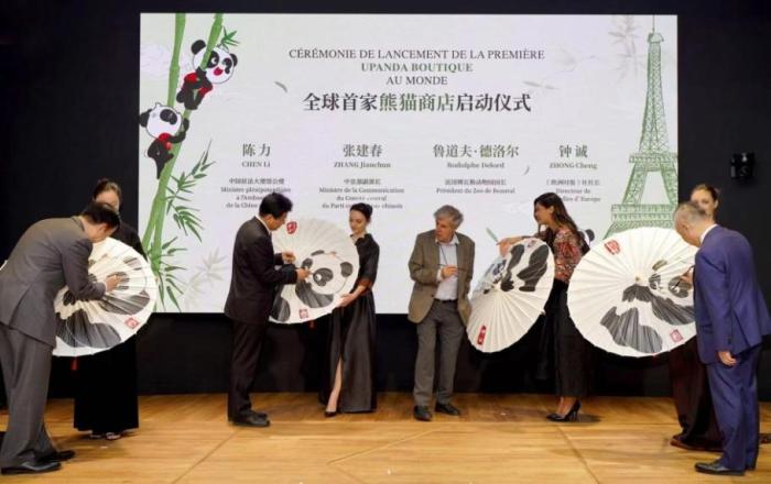 活動現(xiàn)場,張建春副部長向法國國立東方語言文化學(xué)院和法國電視五臺贈送了《中華之美》系列叢書與《風(fēng)箏·風(fēng)箏》創(chuàng)作手記,并宣布“大美中國世界行?東方云裳”文化之約系列活動正式啟動,與雷米·艾融主席共同為活動揭幕。隨后,張建春副部長、我駐法大使館陳力公使、法國博瓦勒動物園代表、《歐洲時(shí)報(bào)》社社長鐘誠共同為中國大熊貓國際形象“阿璞”點(diǎn)睛,啟動全球首家“熊貓商店”文創(chuàng)空間進(jìn)入巴黎。在中外嘉賓的共同見證下,五洲傳播中心與法國REAL WORKS影視制作公司、中航影業(yè)簽署了中法合拍紀(jì)錄片《東方美學(xué)》國際傳播項(xiàng)目合作協(xié)議。