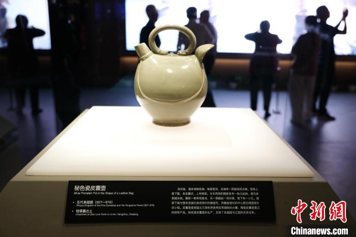 10月11日,浙江吳越文化博物館展出的秘色瓷皮囊壺?!×植?攝