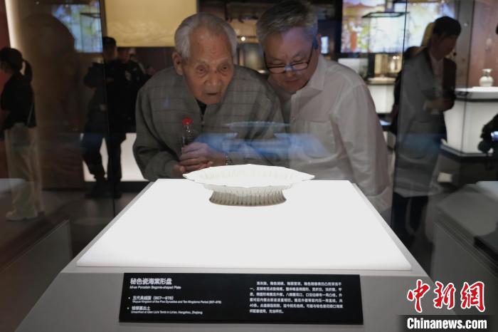 10月11日,民眾在浙江吳越文化博物館觀看秘色瓷海棠形盤?!×植?攝