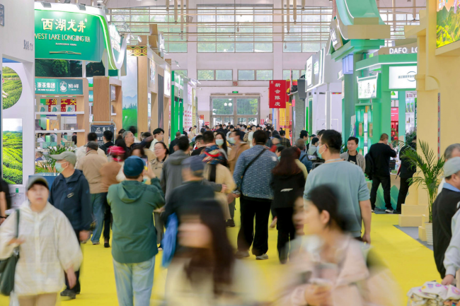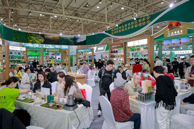 在西湖龍井展團,杭州西湖龍井茶葉有限公司、杭州正浩茶葉有限公司、杭州茶廠有限公司等10 家核心產(chǎn)區(qū)龍頭企業(yè)帶著 2025 年西湖龍井新茶展出,吸引眾多消費者駐足品嘗、咨詢購買。