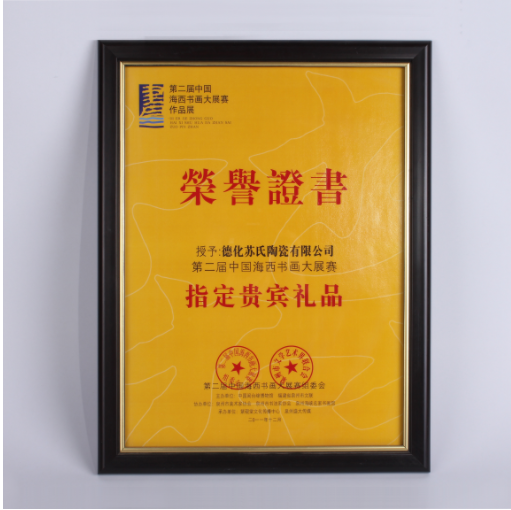 德化蘇氏陶瓷有限公司作為惟一指定貴賓禮品贊助商合作本次活動。展覽共展出30件獲獎作品、100件入展作品。另有近百件入選作品在泉州錦繡莊民間藝術(shù)園二樓海峽名家書畫館同期展出。據(jù)悉,德化蘇氏陶瓷有限公司已經(jīng)是第二次參與舉辦海西書畫大賽。作為全國著名藝術(shù)盛會,海西書畫大展賽組委會對禮品贊助的要求非常嚴(yán)格,因?yàn)樗澲Y品是用于贈送來自全國各地著名書畫藝術(shù)家的,所以必須具備是泉州本土特色產(chǎn)品,又必須格調(diào)高雅,技法精良。經(jīng)過層層考察,最終選定德化蘇氏陶瓷有限公司專為大賽定制的“永豐祥”牌商務(wù)三件套禮品。