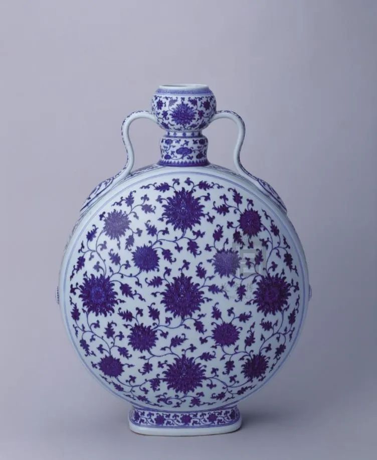 扁壺蒜頭形口,短頸,口與肩之間對(duì)稱置如意形耳,圓腹,腹壁的兩側(cè)各凸飾一個(gè)鼓釘,長(zhǎng)方形圈足。內(nèi)施白釉,外壁通體繪青花纏枝蓮紋,輔以花卉、靈芝、梅花等邊飾。圈足內(nèi)施白釉。外底署青花篆書“大清乾隆年制”三行六字款。