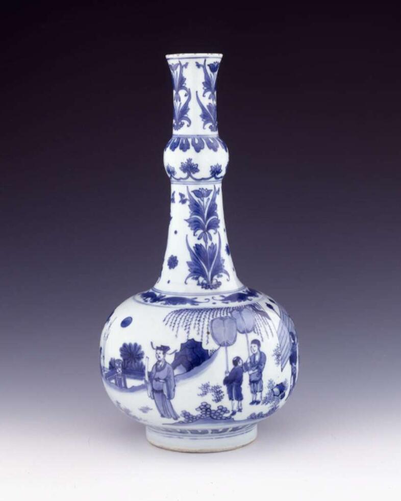 第二個瓶子的一側顯示了四個人聚集在一匹跛腿的鞍馬周圍。一個人拿著一把折疊的陽傘,另一個人拿著馬的統(tǒng)治,第三個人靠在他的杖上,第四個人拿著一根伸向馬的棍子。所有的人物都穿著帽子,交叉長袍,系在腰部的褲子和靴子。另一邊,一位頭戴官翼紗帽的書生,在侍從手下拿著扇子,正與另一名戴檐帽的男子交談。另外兩名仆人站在不遠處,拿著包括一匹布在內(nèi)的禮物。圍繞這些人物的是風景,場景的結尾以典型的“過渡”風格標記,有一排旋轉的云。三朵西洋花,可能是郁金香,裝飾在脖子上,并在頂部重復。