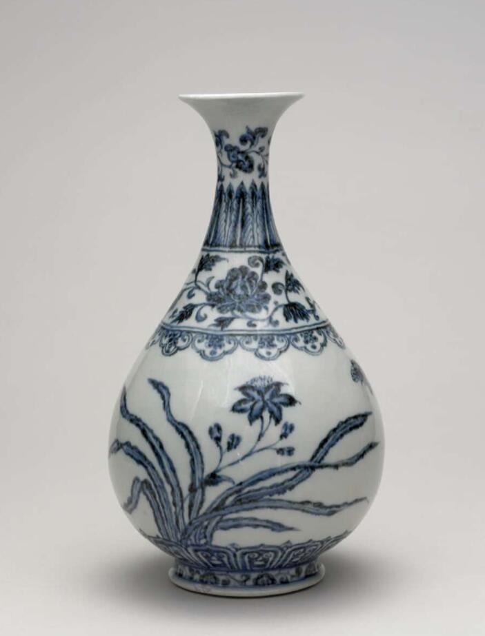 ? ? ??黃花菜瓶 陶工在這個梨形的玉壺春瓶玉壺春瓶的兩側畫了開花的黃花菜,每個瓶上都有一只蝴蝶盤旋。在中國,香味濃郁的百合傳統(tǒng)上象征著和諧與團結。他們在這里的自然主義描繪受到墨水和?彩色小幅面畫。這種設計在幸存的中國瓷器中極為罕見,并且非常巧妙地執(zhí)行。每片葉片狀的葉子和花瓣邊緣都用更濃的藍色勾勒出輪廓,并用淡藍色水洗填充。在蝴蝶的描繪中也實現(xiàn)了類似的藍色漸變。這種對釉下鈷顏料的出色控制是最好的永樂青花瓷的特征。