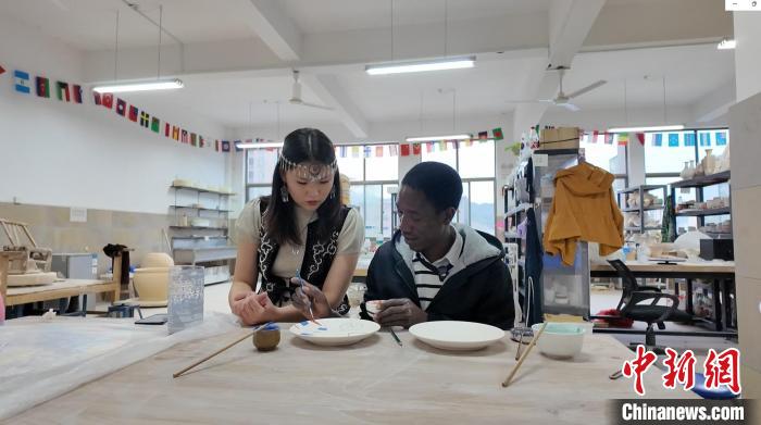 “我們在一個瓷盤上呈現(xiàn)了三個國家的文化?!痹谖挥诰暗骆?zhèn)陶瓷大學國際學院留學生工作室內(nèi),該校烏干達籍留學生羅伯特,與來自江西中醫(yī)藥大學的哈薩克斯坦留學生博塔一道,在瓷盤上畫下多色人面、紅色的龍和藍黃相間的駱駝腳印。