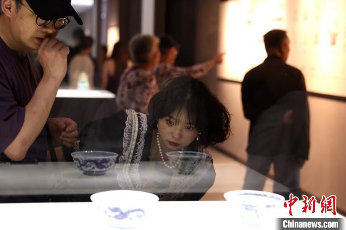 圖為游客在博物館內(nèi)參觀青花瓷碗