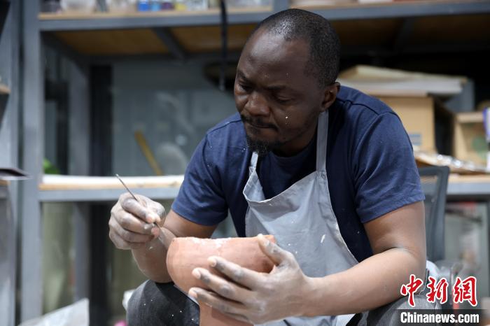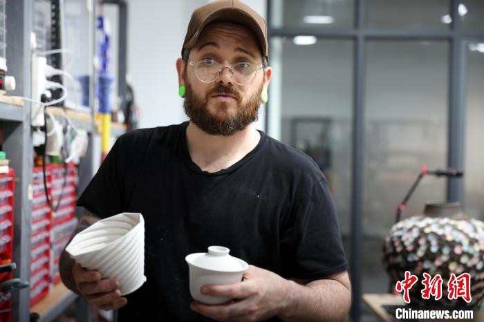 2025年5月,西班牙陶藝師喬曼展示他的陶瓷作品。受訪者供圖