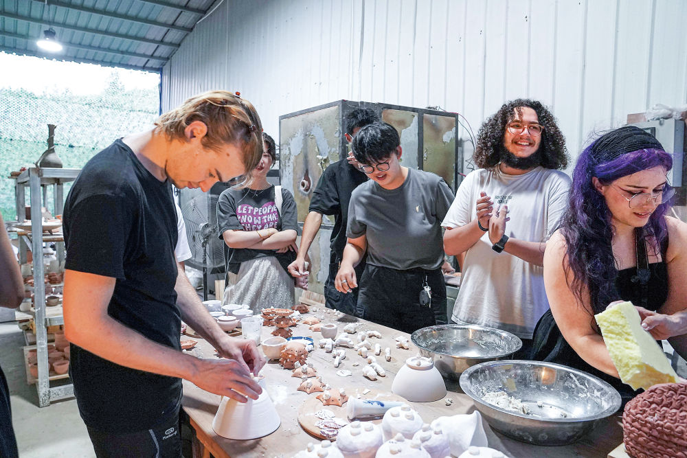 學(xué)生在景德鎮(zhèn)陶瓷大學(xué)的一處窯爐旁一起創(chuàng)作、討論(2024年7月17日攝)。新華社記者周密攝