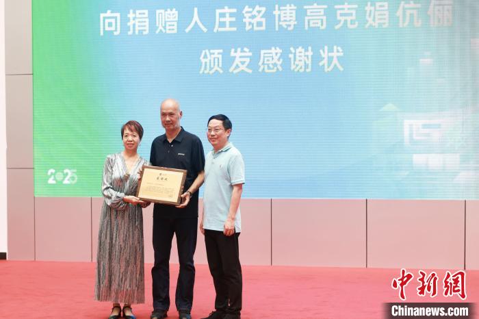 5月18日,“器載歸途——莊銘博高克娟伉儷海外收藏捐贈(zèng)特展”在晉江市博物館開(kāi)展。圖為向捐贈(zèng)人莊銘博、高克娟伉儷頒發(fā)感謝狀。劉翼 攝