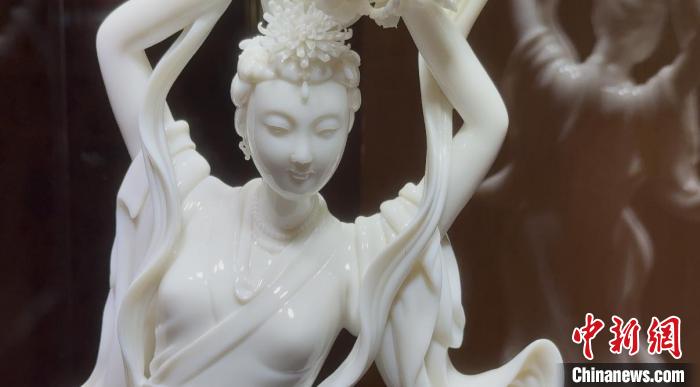 11日,全球文明對話部長級會議“文明交流互鑒與文化傳承創(chuàng)新”分論壇外,設(shè)“中國白”德化陶瓷展覽。圖為展出作品《天女散花》(局部)