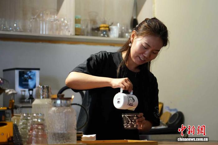 8月19日,陳鈺淇咖啡店的工作人員用磁州窯系列咖啡杯為顧客制作咖啡?! ±顥?攝